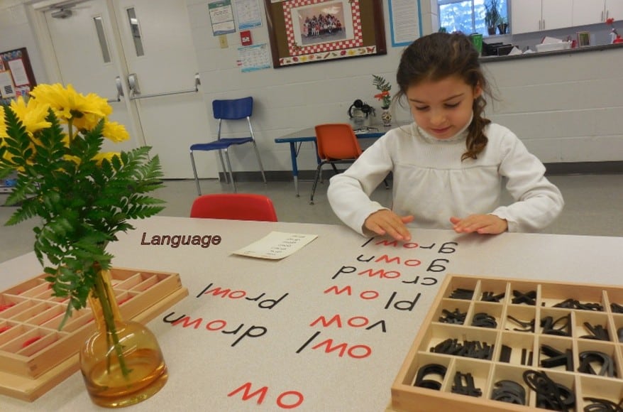 Once children progress from reading words (mostly nouns), to reading phrases and finally sentences and paragraphs, we offer activities to highlight how different words have different functions. These exercises also highlight the syntax or order of words (e.g. adjectives tend to come before the noun they are describing). Another set of exercises, called reading analysis, highlights the role or the order of parts of a sentence. In the process of understanding the components of our language, children are better able to interpret what the author is writing.